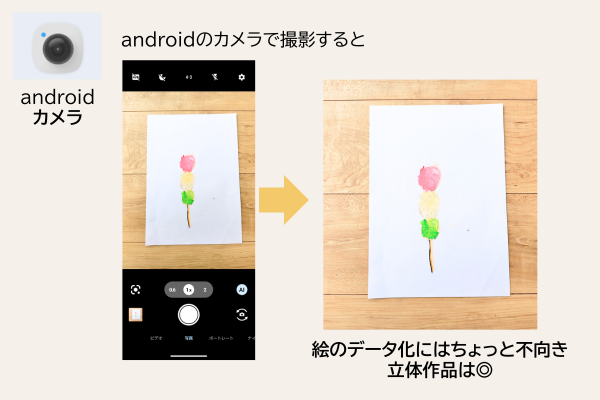 メリット:立体作品(アイロンビーズなど)や絵がいつでも見返せる。四つ切りサイズの絵も見やすくなる。スマホのアプリで簡単に作成